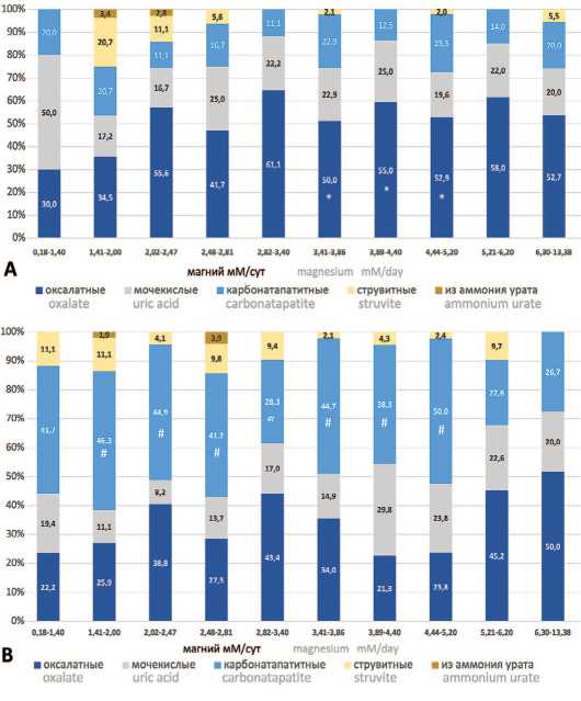 Fig. 2. Increasing of magnesium excretion (mM/day) and urinary stones composition (% of total stones) in men(A) and women(B). Comparison of oxalate stones: men(A) vs women(B) * - р <0,005, (χ 2 test); comparison of carbonata-patite stones: men(A) vs women(B) # - р <0,005, #t - р =0,052 (χ 2 test)