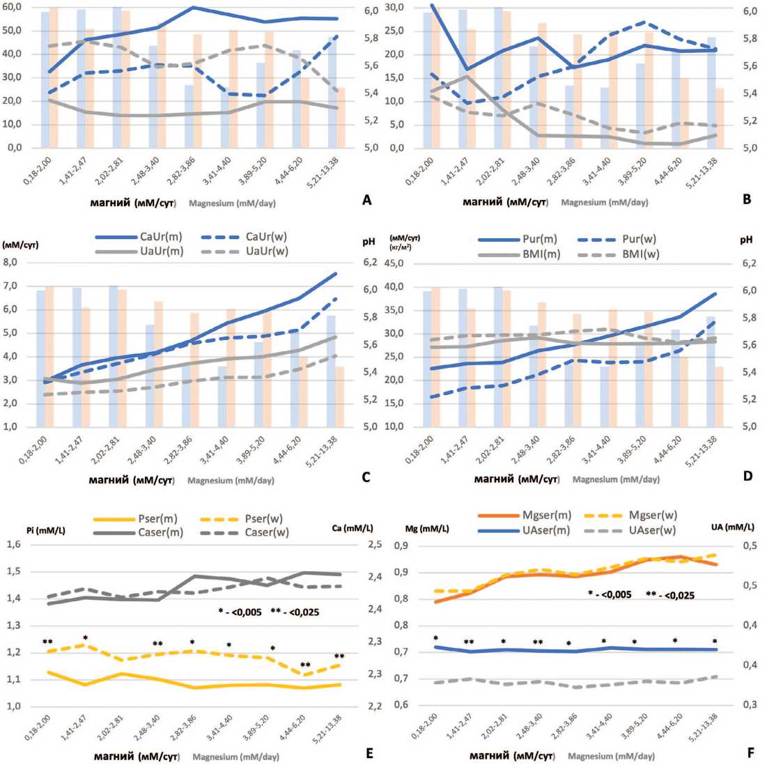 В отличие от показателей экскреции фосфатов и мочевой кислоты, соответствующие сывороточные метаболические показатели у пациентов с МКБ при нарастающей магнийурии были более стабильны. Уровень фосфатемии и урикоземии оставался практически постоянным при всех значениях магнийурии (рис. 3E, F). У мужчин фосфатемия была ниже, чем у женщин на 5-14%, а уровень мочевой кислоты крови был выше на 10-14% (рис. 3E, F, р <0,025).