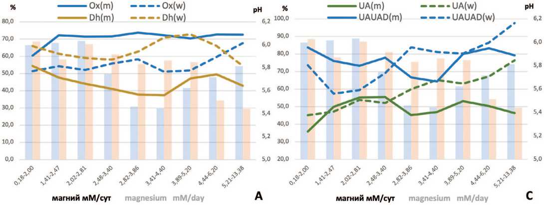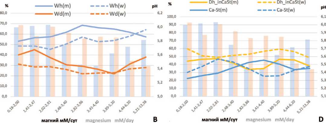 Fig. 3. Urinary stones types frequency and biochemical parameters of urine and blood in magnesiuria of varying degrees in men and women. The values of magnesium excretion (mM/day) in 10% percentiles of distribution using moving averages are indicated on the abscissa axis; Urine pH values in men (blue columns), in women (orange columns).