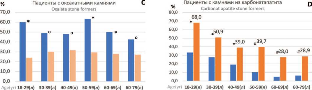 Рис. 5. Распределение в возрастных группах мужчин и женщин с МКБ ( A ), показателей экскреции магния (мМ/сут) ( B ), пациентов с оксалатными камнями ( C ) и пациентов с камнями из карбонатапатита ( D ) (в % от общего числа пациентов); * р <0,05* p <0,01, о р <0,10 при сравнении различий показателей между мужчинами и женщинами ( A,C,D - х 2 тест; B - U-критерий Манна-Уитни). Группа 60-79 (л) на ( A-D ) представлена дополнительно из-за малочисленности группы 70-79 (л)