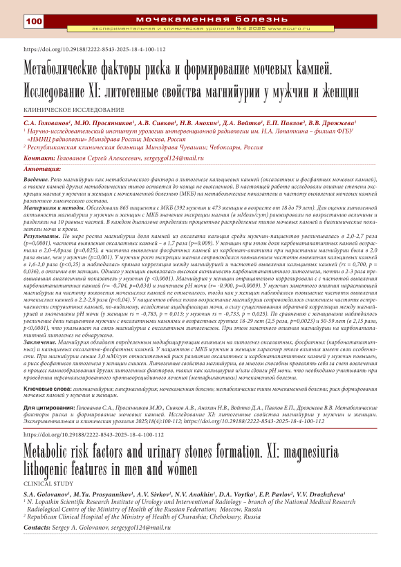 Введение. Роль магнийурии как метаболического фактора в литогенезе кальциевых камней (оксалатных и фосфатных мочевых камней), а также камней других метаболических типов остается до конца не выясненной. В настоящей работе исследовали влияние степени экскреции магния у мужчин и женщин с мочекаменной болезнью (МКБ) на метаболические показатели и частоту выявления мочевых камней различного химического состава. Материалы и методы. Обследовали 865 пациента с МКБ (392 мужчин и 473 женщин в возрасте от 18 до 79 лет). Для оценки литогенной активности магнийурии у мужчин и женщин с МКБ значения экскреции магния (в мМоль/сут) ранжировали по возрастанию величины и разделяли на 10 равных частей. В каждом диапазоне определяли процентное распределение типов мочевых камней и биохимические показатели мочи и крови. Результаты. По мере роста магнийурии доля камней из оксалата кальция среди мужчин-пациентов увеличивалась в 2,0-2,7 раза (p=0,0001), частота выявления оксалатных камней – в 1,7 раза (p=0,009). У женщин при этом доля карбонатапатитных камней возрастала в 2,0-4,0раза (p=0,025), а частота выявления фосфатных камней из карбонат-апатита при нарастании магнийурии была в 2,0 раза выше, чем у мужчин (p=0,001). У мужчин рост экскреции магния сопровождался повышением частоты выявления кальциевых камней в 1,6-2,0 раза (р<0,25) и наблюдалась прямая корреляция между магнийурией и частотой выявления кальциевых камней (rs = 0,700, р = 0,036), в отличие от женщин. Однако у женщин выявлялась высокая активность карбонатапатитного литогенеза, почти в 2-3 раза превышавшая аналогичный показатель у мужчин (p <0,0001). Магнийурия у женщин отрицательно коррелировала с с частотой выявления карбонатапатитных камней (r= -0,704, p=0,034) и значением рН мочи (r= -0,900, р=0,0009). У мужчин заметного влияния нарастающей магнийурии на частоту выявления мочекислых камней не отмечалось, тогда как у женщин наблюдалось повышение частоты выявления мочекислых камней в 2,2-2,8 раза (р<0,04). У пациентов обоих полов возрастание магнийурии сопровождалось снижением частоты встречаемоcти струвитных камней, по-видимому, вследствие ацидификации мочи, в силу существования обратной корреляции между магний-урией и значениями рН мочи (у женщин rs = -0,783, р = 0,013; у мужчин rs = -0,733, р = 0,025). По сравнению с женщинами наблюдалось увеличение доли пациентов мужчин с оксалатными камнями в возрастных группах 18-29 лет (2,5 раза, р=0,0023) и 50-59 лет (в 2,15 раза, р<0,0001), что указывает на связь магнийурии с оксалатным литогенезом. При этом заметного влияния магнийурии на карбонатапатитный литогенез не обнаружено. Заключение. Магнийурия обладает определенным модифицирующим влиянием на литогенез оксалатных, фосфатных (карбонатапатитных) и кальциевых оксалатно-фосфатных камней. У пациентов с МКБ мужчин и женщин характер этого влияния имеет свои особенности. При магнийурии свыше 3,0 мМ/сут относительный риск развития оксалатных и карбонатапатитных камней у мужчин повышен, а риск фосфатного литогенеза у женщин снижен. Литогенные свойства магнийурии, во многом способны проявлять себя за счет вовлечения в процесс камнеобразования других литогенных факторов, таких как кальциурия и/или сдвиги рН мочи. что необходимо учитывать при проведении персонализированного противорецидивного лечения (метафилактики) мочекаменной болезни.