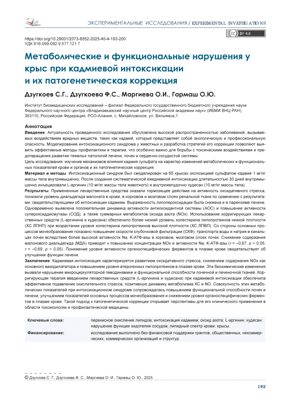 Введение. Актуальность проведенного исследования обусловлена высокой распространенностью заболеваний, вызываемых воздействием вредных веществ, таких как кадмий, который представляет собой экологическую и профессиональную опасность. Моделирование интоксикационного синдрома у животных и разработка стратегий его коррекции позволяют выявить эффективные методы профилактики и терапии, что особенно важно для борьбы с токсическими воздействиями и предотвращения развития тяжелых патологий печени, почек и сердечно-сосудистой системы. Цель исследования: изучение механизмов влияния кадмия сульфата на характер изменений метаболических и функциональных показателей крови и органов и их патогенетическая коррекция. Материал и методы. Интоксикационный синдром был смоделирован на 65 крысах экспозицией сульфатом кадмия 1 мг/кг массы тела внутримышечно. После создания систематической ежедневной интоксикации длительностью 30 дней внутримышечно инъецировали L-аргинин (10 мг/кг массы тела животного) и внутрижелудочно кудесан (10 мг/кг массы тела). Результаты. Примененные лекарственные средства оказали тормозящее действие на активность оксидативного стресса, понизили уровень диальдегида малоната в крови, в корковом и мозговом слоях ренальной ткани по сравнению с результатами, свидетельствующими об интоксикации кадмием. Выраженность липопероксидации была снижена и в паренхиме печени. Одновременно выявлена положительная динамика активности антиоксидантной системы (АОС) и повышение активности супероксиддисмутазы (СОД), а также суммарных метаболитов оксида азота (NOx). Использование корригирующих лекарственных средств (L-аргинина и кудесана) обеспечило более низкий уровень холестерина липопротеинов низкой плотности (ХС ЛПНП) при возрастании уровня холестерина липопротеинов высокой плотности (ХС ЛПВП). Со стороны основных процессов мочеобразования показано повышение скорости клубочковой фильтрации (СКФ), транспорта воды и натрия в канальцах почек вследствие более высокой активности Na, K-АТФ-азы в корковом, мозговом слоях почек. Снижение содержания малонового диальдегида (МДА) приводит к повышению концентрации NOx и активности Na, K-АТФ-азы (r = –0,67, р < 0,05; r = –0,69, р < 0,05). Понижение уровня активности органоспецифических ферментов в плазме крови свидетельствует об улучшении функции печени. Заключение. Кадмиевая интоксикация характеризуется развитием оксидативного стресса, снижением содержания NOх как основного вазодилататора и повышением уровня атерогенных липопротеинов в плазме крови. Эти биохимические изменения вызвали нарушение микроциркуляторной гемодинамики и функциональной способности почечной и печеночной тканей. Корригирующая терапия введением лекарственных средств (L-аргинина и кудесана) при кадмиевой интоксикации обеспечила эффективное подавление окислительного стресса, позитивную динамику метаболизма ХС и NO. Совокупность этих метаболических показателей при интоксикационном синдроме сопровождалась повышением функциональной способности почек и печени, улучшением показателей основных процессов мочеобразования и снижением уровня органоспецифических ферментов в плазме крови. Такой подход к патогенетической коррекции открывает перспективы для его клинического применения в области токсикологии и профила