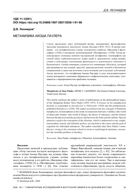 This article continues the author’s series of publications on the philosophical legacy of the Hungarian thinker Ákos Pauler (1876–1933). It focuses on his metaphysical doctrine as expounded in Introduction to Philosophy (1920) and the posthumously published Metaphysics (1938). The author reconstructs the key concepts of Paulerian metaphysics: hylomorphism as the mode of connection between «validity» (the world of ideas) and «reality» (the world of things), the theory of substance, and the relation between the physical and the psychical, and between the finite and the infinite. Special attention is paid to his conception of the Absolute, which is understood as one, simple, transcendent, eternal, and infinitely perfect, serving both as the source and the goal of cognition for individual substances. The author concludes that Ákos Pauler’s metaphysics, owing to his consistent refusal to resort to mythological epistemes, encounters the insoluble problem of theodicy.