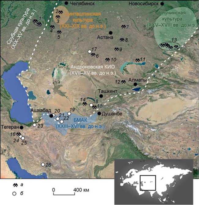 а – древние рудники и месторождения: 1 – Каргалинское рудное поле, 2 – Новотемирский, 3 – Воровская яма, 4 – Ишкининский, 5 – Еленовский, 6 – Жезказган, 7 – Бозшаколь, 8 – Ал-тынтобе, 9 – Успенское, 10 – Кенказган, 11 – Саяк, 12 – Шатырколь, 13 – Калба-Нарымские месторождения (Sn), 14 – Карнаб (Sn), 15 – Мушистон (Cu, Sn), 16 – Вешнаве; б – поселения: 17 – Талдысай, 18 – Тугай, 19 – Гонур-Депе, 20 – Анау, 21 – Намазга-Депе, 22 – Алтын-Депе, 23 – Тепе Гиссар, 24 – Тепе Сиалк, 25 – Арисман, 26 – Тепе Яхья.