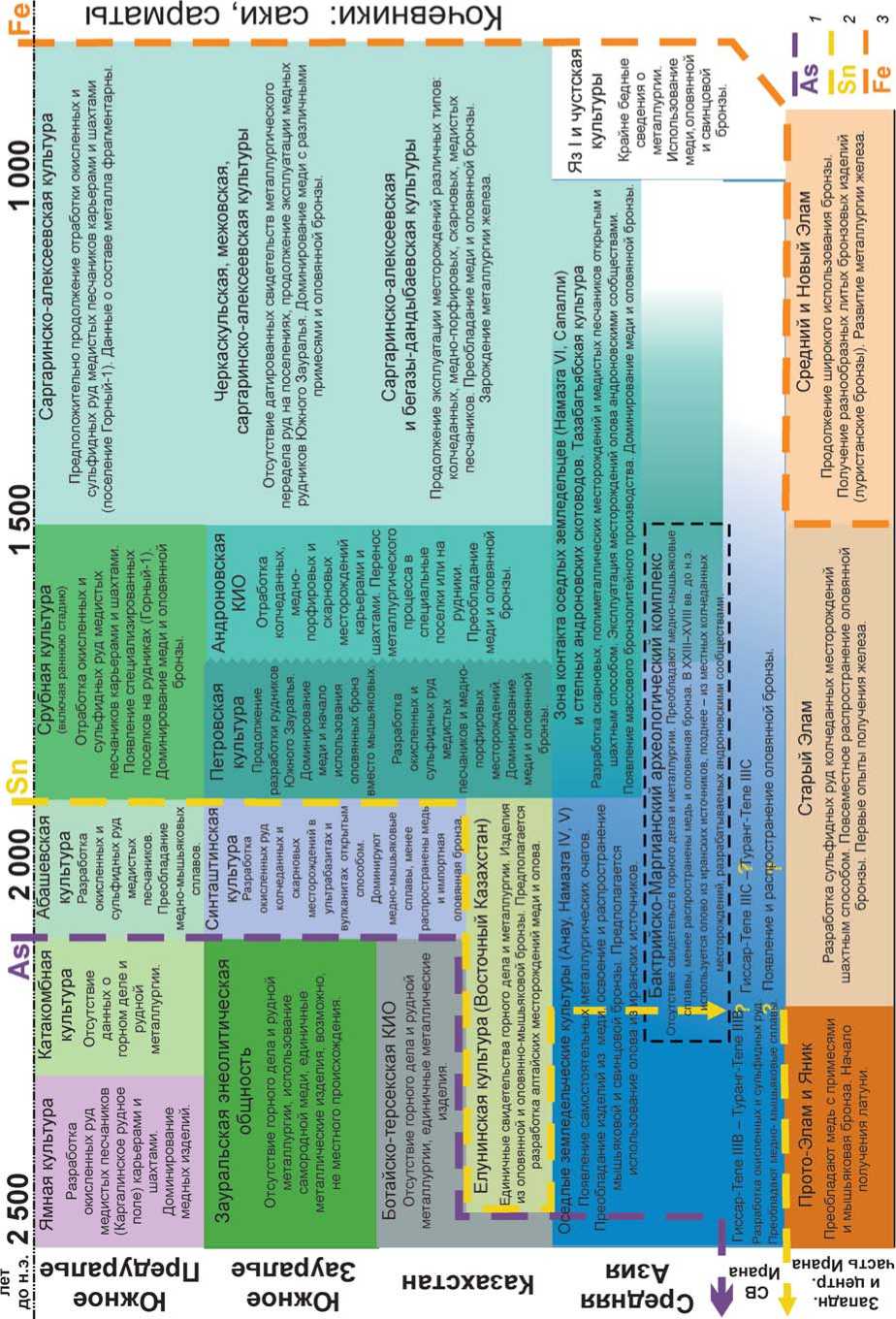 Технологии горного дела и металлургии бронзового века на территории Южного Урала, Казахстана, Средней Азии и Иранского нагорья в своем развитии прошли этапы, характерные для всей Центральной Евразии. Наиболее архаичный способ добычи меди сводился к поискам самородного металла. Позднее открытым способом начали отрабатываться верхние горизонты зоны окисления медных месторождений, затем шахтным способом богатые сульфидные руды зоны вторичного обогащения. Пока здесь нет доказательств массового использования халькопиритовых руд. Аналогичен порядок смены различных металлов: чистая медь – мышьяковая бронза – оловянная – железо. Начало и продолжительность периодов их использования варьируются в различных сообществах. Один из наиболее ранних опытов получения мышьяковой бронзы зафиксирован в Тепе Яхья (Южный Иран), где найдено шило из этого металла, датируется второй половиной V тыс. до н.э. [Thornton, 2010]. Но еще несколько столетий самородная медь не уступает место мышьяковой бронзе. Оловянные бронзы, появившись в Луристане в конце IV тыс. до н.э., также не получают широкого распространения еще тысячу лет [Oudbashi, Emami, Davami, 2012]. В этот длинный промежуток времени доминируют медь и мышьяковая бронза.