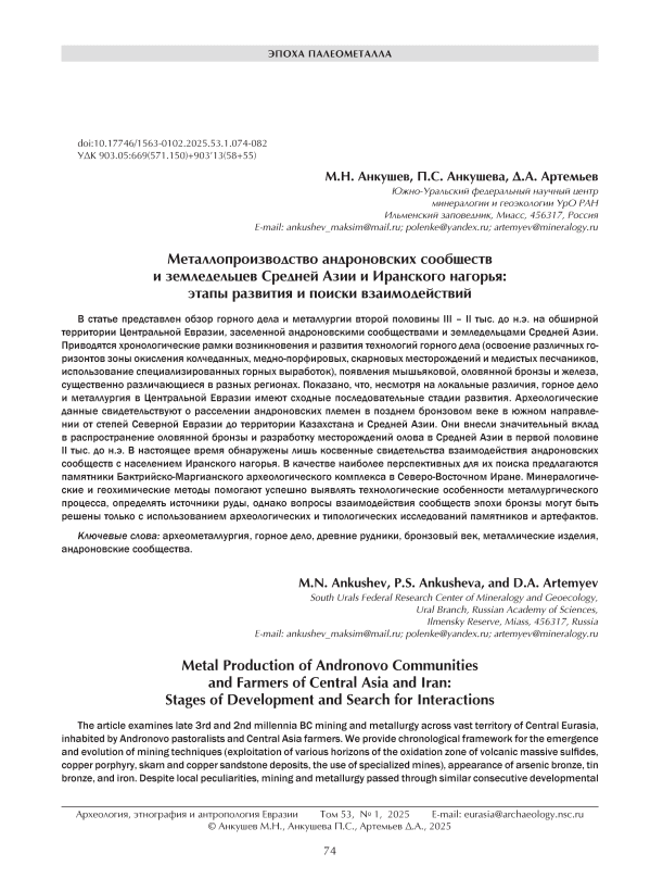 The article examines late 3rd and 2nd millennia BC mining and metallurgy across vast territory of Central Eurasia, inhabited by Andronovo pastoralists and Central Asia farmers. We provide chronological framework for the emergence and evolution of mining techniques (exploitation of various horizons of the oxidation zone of volcanic massive sulfi des, copper porphyry, skarn and copper sandstone deposits, the use of specialized mines), appearance of arsenic bronze, tin bronze, and iron. Despite local peculiarities, mining and metallurgy passed through similar consecutive developmental stages in Central Eurasia. Archaeological data suggest that in the Late Bronze Age, Andronovo communities settled southwards from the steppes of Northern Eurasia to Kazakhstan and Central Asia. They played a major role in the spread of tin bronze and the exploitation of tin mines in Central Asia in the fi rst half of the 2nd millennium BC. So far, there is only indirect evidence of contacts between Andronovo communities and people of the Iranian highlands. The most promising sites that may yield such evidence are those of the Bactria-Margiana Archaeological Complex in northeastern Iran. Mineralogical and geochemical research methods help to assess the technological features of metallurgy and to discover ore sources; however, the interaction between Bronze Age communities can be explored only through archaeological and typological studies of sites and artifacts.