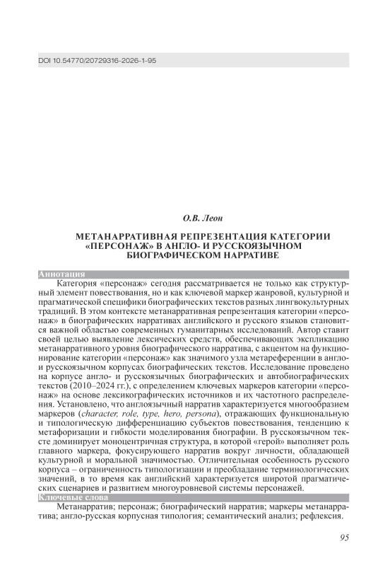 Категория «персонаж» сегодня рассматривается не только как структурный элемент повествования, но и как ключевой маркер жанровой, культурной и прагматической специфики биографических текстов разных лингвокультурных традиций. В этом контексте метанарративная репрезентация категории «персонаж» в биографических нарративах английского и русского языков становится важной областью современных гуманитарных исследований. Автор ставит своей целью выявление лексических средств, обеспечивающих экспликацию метанарративного уровня биографического нарратива, с акцентом на функционирование категории «персонаж» как значимого узла метареференции в англои русскоязычном корпусах биографических текстов. Исследование проведено на корпусе англои русскоязычных биографических и автобиографических текстов (2010–2024 гг.), с определением ключевых маркеров категории «персонаж» на основе лексикографических источников и их частотного распределения. Установлено, что англоязычный нарратив характеризуется многообразием маркеров (character, role, type, hero, persona), отражающих функциональную и типологическую дифференциацию субъектов повествования, тенденцию к метафоризации и гибкости моделирования биографии. В русскоязычном тексте доминирует моноцентричная структура, в которой «герой» выполняет роль главного маркера, фокусирующего нарратив вокруг личности, обладающей культурной и моральной значимостью. Отличительная особенность русского корпуса – ограниченность типологизации и преобладание терминологических значений, в то время как английский характеризуется широтой прагматических сценариев и развитием многоуровневой системы персонажей.