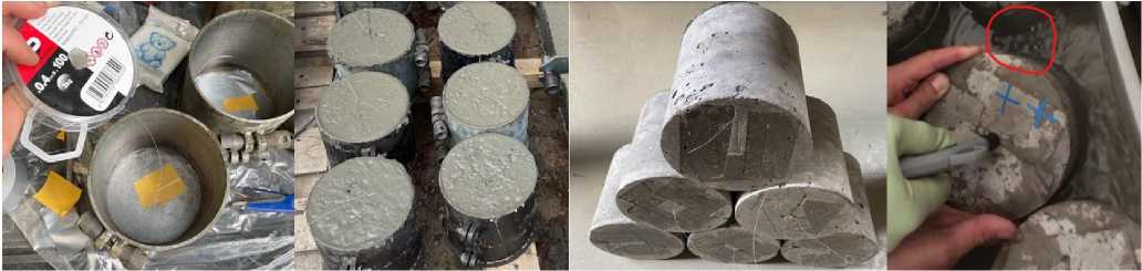 The six specimens for every composition were produced using formwork with a fixed string to create a through-channel. After production, stripping, and string removal, a qualitative air-permeability test was performed by observing the presence or absence of bubbles at the lower end of the immersed specimen while forcing air onto the upper end surface using a hand pump. The specimens were kept horizontally in water for 65 days, after which a qualitative air permeability test was performed, followed by a quantitative air permeability test using a BB-2 device and a quantitative test using a UVF-6 installation.