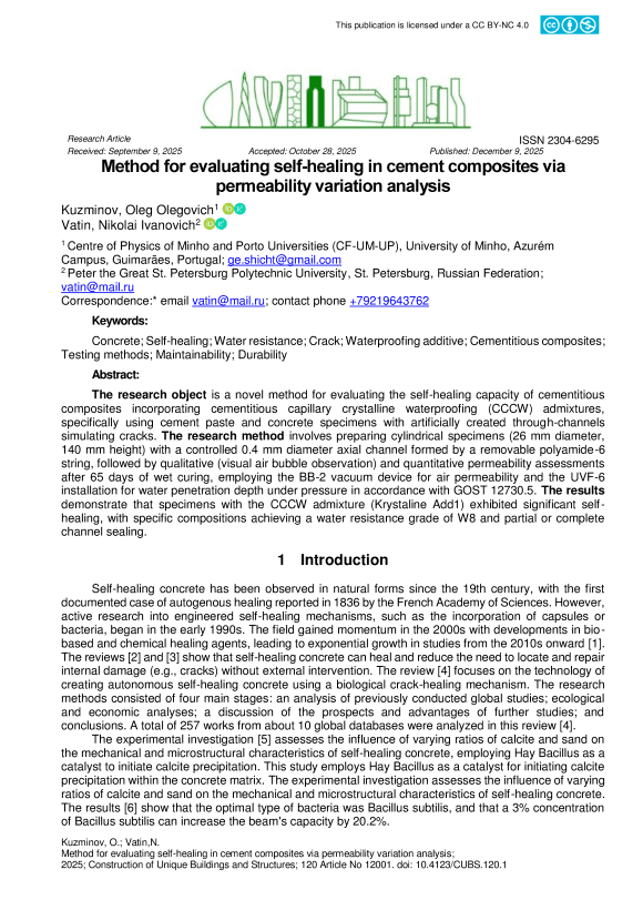 Текст научной статьи Method for evaluating self-healing in cement composites via permeability variation analysis