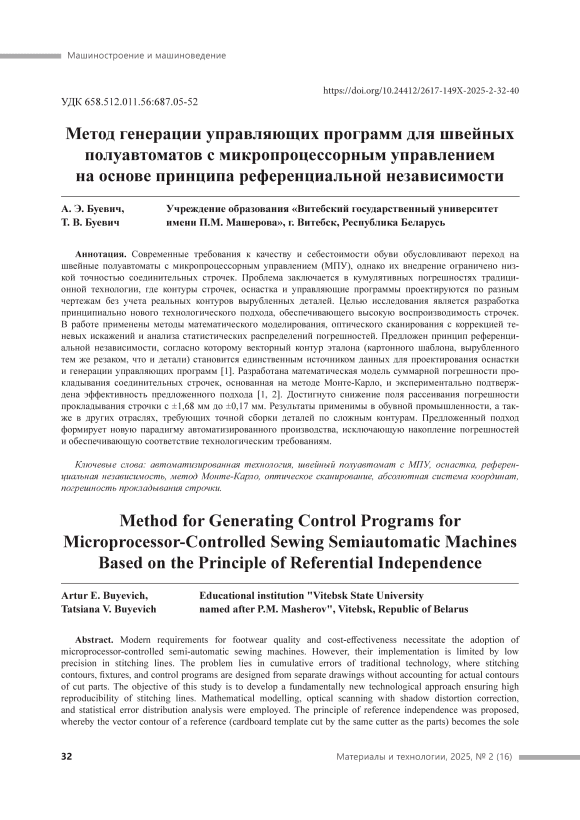 Современные требования к качеству и себестоимости обуви обусловливают переход на швейные полуавтоматы с микропроцессорным управлением (МПУ), однако их внедрение ограничено низкой точностью соединительных строчек. Проблема заключается в кумулятивных погрешностях традиционной технологии, где контуры строчек, оснастка и управляющие программы проектируются по разным чертежам без учета реальных контуров вырубленных деталей. Целью исследования является разработка принципиально нового технологического подхода, обеспечивающего высокую воспроизводимость строчек. В работе применены методы математического моделирования, оптического сканирования с коррекцией теневых искажений и анализа статистических распределений погрешностей. Предложен принцип референциальной независимости, согласно которому векторный контур эталона (картонного шаблона, вырубленного тем же резаком, что и детали) становится единственным источником данных для проектирования оснастки и генерации управляющих программ [1]. Разработана математическая модель суммарной погрешности прокладывания соединительных строчек, основанная на методе Монте-Карло, и экспериментально подтверждена эффективность предложенного подхода [1, 2]. Достигнуто снижение поля рассеивания погрешности прокладывания строчки с ±1,68 мм до ±0,17 мм. Результаты применимы в обувной промышленности, а также в других отраслях, требующих точной сборки деталей по сложным контурам. Предложенный подход формирует новую парадигму автоматизированного производства, исключающую накопление погрешностей и обеспечивающую соответствие технологическим требованиям.