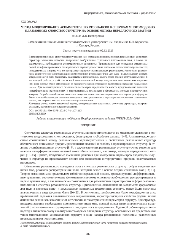 В пространственных спектрах пропускания или отражения многомодовых плазмонных слоистых структур, элементы которых допускают возбуждение отдельных плазмонных мод, а также их взаимосвязь, наблюдаются асимметричные резонансы. Традиционно для описания амплитуды полей для фиксированных спектральных параметров в таких системах слоев используется метод передаточных матриц, что не раскрывает природу возникающих резонансов. Ранее были разработаны аналитические аппроксимации асимметричных резонансов Фано для однои двухмодовых систем, которые не могут быть расширены на системы с произвольным количеством слоев и возбуждаемых мод. В настоящей работе разработан новый математический метод получения аналитических выражений вида формул Фано как функций от геометрических и оптических параметров составных плазмонных систем. Для асимметричных резонансов в спектрах предлагается ввести представление поля как интерференцию резонансных и нерезонансных компонент в формализм метода передаточных матриц. Разработанный метод позволяет получить аналитические выражения для параметров формулы Фано, что необходимо для описания поведения таких резонансных характеристик составных плазмонных систем, как ширина, высота, максимальное усиление поля.