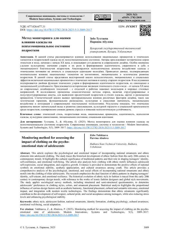 В данной статье рассматривается влияние использования национальных орнаментов и этнических элементов в подростковой одежде на их психоэмоциональное состояние. Авторы прослеживают исторические корни этностиля в моде, начиная с начала XX века, и показывают его развитие в современном дизайне. Особое внимание уделено культурному значению узоров и их роли в формировании идентичности, уверенности в себе и эмоционального благополучия подростков. Анализируются психологические аспекты воздействия одежды с этническими мотивами на личность и социальную адаптацию молодёжи. Приводятся данные, подтверждающие положительное влияние национальных элементов на когнитивное, эмоциональное и эстетическое развитие подростков. В данной статье представлен всесторонний анализ психологических, эмоциональных и социальных эффектов включения национальных орнаментов и этнических мотивов в одежду старших подростков. В исследовании подчеркивается двойная функция этнических узоров – как эстетических украшений и как носителей культурного наследия – в формировании идентичности подростков, их самооценки и эмоциональной устойчивости. Прослеживается историческая эволюция этнического стиля в моде – от начала XX века до современных дизайнерских тенденций – с отсылкой к работам знаковых модельеров и мировых стилевых направлений. В исследовании применены социологические методы опроса, включая структурированные и полуструктурированные анкеты, для выявления предпочтений подростков в стилях одежды, цветах и размещении орнаментов. Статистический анализ выявил пропорциональное влияние различных факторов дизайна, таких как эстетическая гармония, функциональное размещение, культурная и смысловая значимость, эмоциональное воздействие и интеграция с современными текстильными технологиями. Результаты показали, что этнические орнаменты вносят значительный вклад в развитие самоуважения, культурной гордости и социальной приемлемости среди подростков, одновременно снижая уровень стресса и повышая психологическую устойчивость.