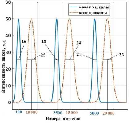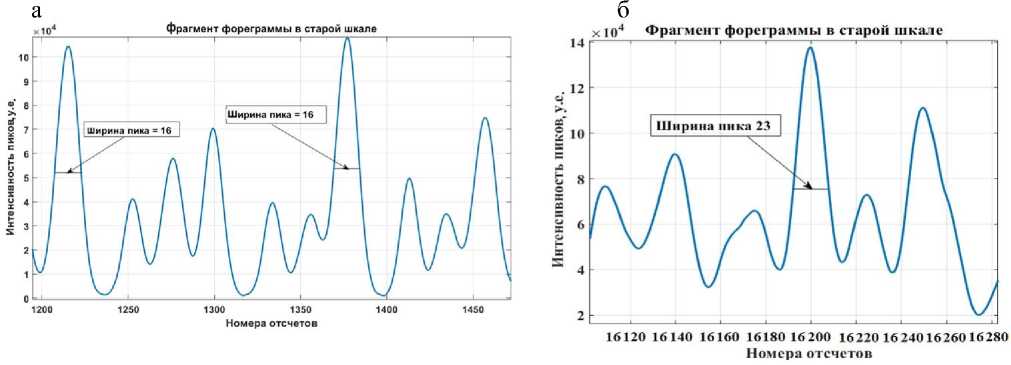 Используя обратную функцию шкалы времени и результат интерполяции между отсчетами, была получена новая шкала времени. В результате использования новой шкалы, величины ширины пиков фореграммы изменились. Ширина пиков в старой шкале в диапазоне отсчетов от 1200