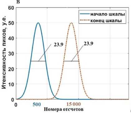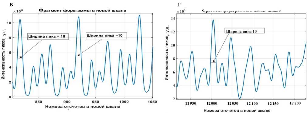 до 1450 составляла 16 единиц, а в диапазоне от 16 120 до 16 280 — 23 единицы. После проведения преобразования фореграмм с использованием обратной функции ширина пиков в указанных, а также в других диапазонах оказалась одинаковой и равной 10 единицам.