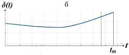 В реальности в нашем распоряжении имеется зарегистрированный физический спектр на шкале t. Этот спектр можно обработать, найти спектральные пики и построить по ним зависимость ширины пиков от времени δ ( t ) (рис. 1).