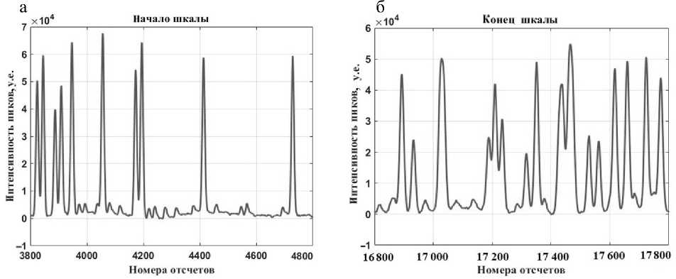Рис. 3. Фрагменты фореграммы: а — в начале шкалы, б — в конце шкалы