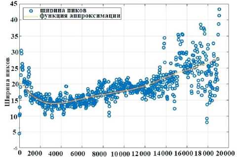 На рис. 4 представлена зависимость ширины пиков в количестве отсчетов на полувысоте пика. Сплошной линией показана аппроксимация этой зависимости полиномом 5-й степени. Аппроксимация этой зависимости была выполнена методом наименьших квадратов для построения линии регрессии. Параметры функции аппроксимации являются характеристикой нелинейности временнóй шкалы