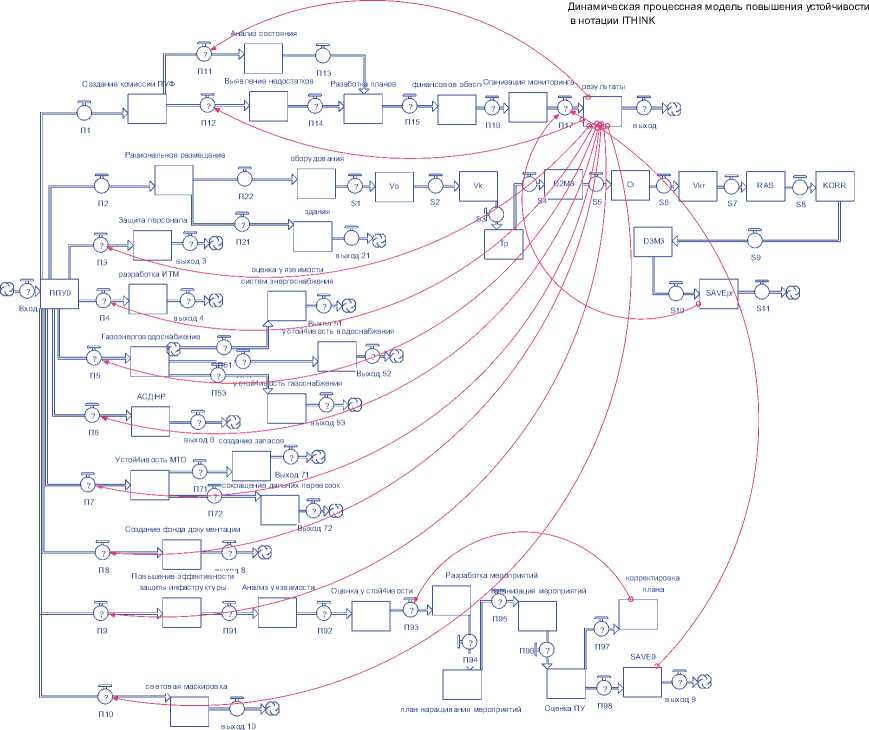 Рис. 1. Схема имитационной процессной модели для 10 процессов системы обеспечения устойчивости производственной инфраструктуры в нотации IThink