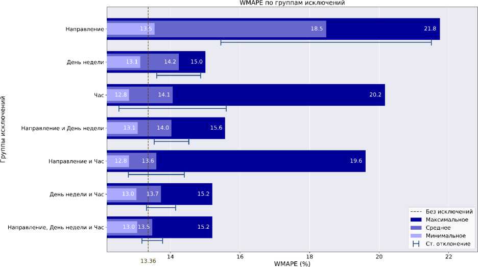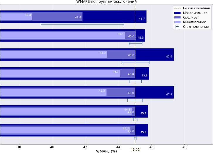 На рисунках 2 и 3 продемонстрированы агрегированные результаты оценки качества с помощью метрики WMAPE для различных сценариев исключения значений признаков. На графике отражены среднее, минимальное и максимальное значения WMAPE, полученные при исключении каждого из значений соответствующего признака или их комбинаций.