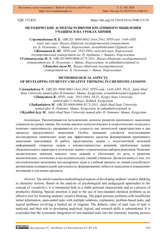 Рассматриваются методические аспекты развития креативного мышления учащихся на уроках химии. На основе анализа психологических и педагогических подходов к понятию «креативность» раскрывается его сущность как личностной характеристики и как процесса продуктивного мышления. Особое внимание уделяется использованию нестандартных химических задач как эффективного средства формирования креативного мышления школьников. В работе представлены задачи с недостаточной исходной информацией, открытые задачи с множественностью решений, проблемные задачи объяснительного характера и логические задачи с ограниченным набором реактивов. Показано дидактическое значение каждого типа заданий и обоснована их роль в развитии аналитических, логических и исследовательских умений учащихся. Делается вывод о том, что систематическое включение нестандартных задач в учебный процесс по химии способствует активизации познавательной деятельности, формированию гибкости мышления и повышению мотивации к изучению предмета.