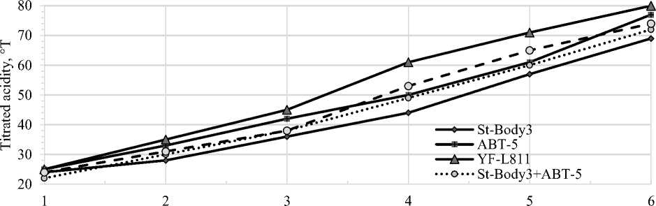 Отмечали, что динамика накопления молочной кислоты была наиболее активной при использовании отдельных штаммов микроорганизмов AT-5 и F–811 и характеризовалась уровнем кислотности в интервале от 70 до 80 ºТ. Кроме того, активность комбинированного состава бактериальной закваски (St–3 + AT-5; St–3 + F-811) позволяет быстрее достичь нормируемых значений кислотности в йогурте и тем самым, сократить технологический цикл производства на 1 час. при наилучших показателях консистенции.