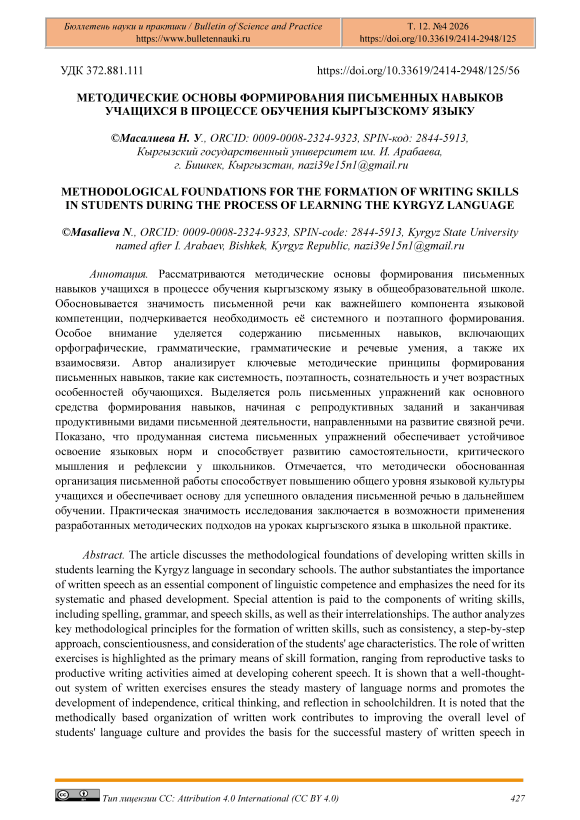 Рассматриваются методические основы формирования письменных навыков учащихся в процессе обучения кыргызскому языку в общеобразовательной школе. Обосновывается значимость письменной речи как важнейшего компонента языковой компетенции, подчеркивается необходимость её системного и поэтапного формирования. Особое внимание уделяется содержанию письменных навыков, включающих орфографические, грамматические, грамматические и речевые умения, а также их взаимосвязи. Автор анализирует ключевые методические принципы формирования письменных навыков, такие как системность, поэтапность, сознательность и учет возрастных особенностей обучающихся. Выделяется роль письменных упражнений как основного средства формирования навыков, начиная с репродуктивных заданий и заканчивая продуктивными видами письменной деятельности, направленными на развитие связной речи. Показано, что продуманная система письменных упражнений обеспечивает устойчивое освоение языковых норм и способствует развитию самостоятельности, критического мышления и рефлексии у школьников. Отмечается, что методически обоснованная организация письменной работы способствует повышению общего уровня языковой культуры учащихся и обеспечивает основу для успешного овладения письменной речью в дальнейшем обучении. Практическая значимость исследования заключается в возможности применения разработанных методических подходов на уроках кыргызского языка в школьной практике.