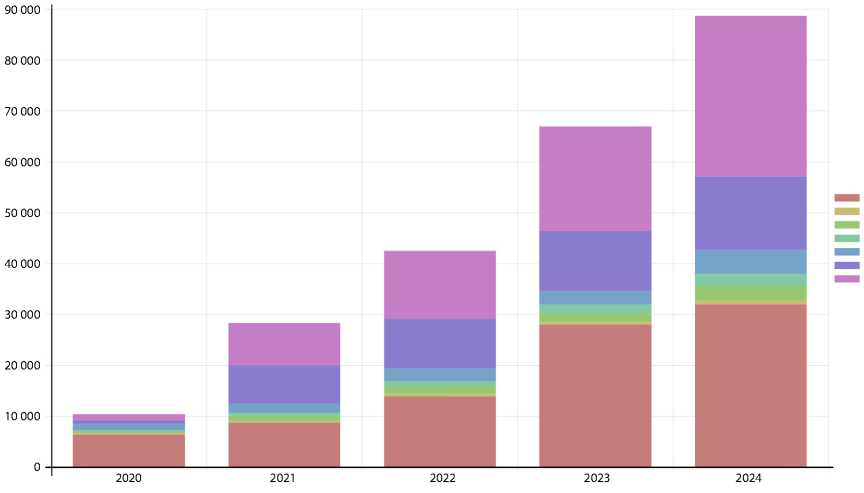 Рис. 4. Отраслевая динамика количества инвестиционных проектов в федеральных округах РФ за 2020–2024 гг.
