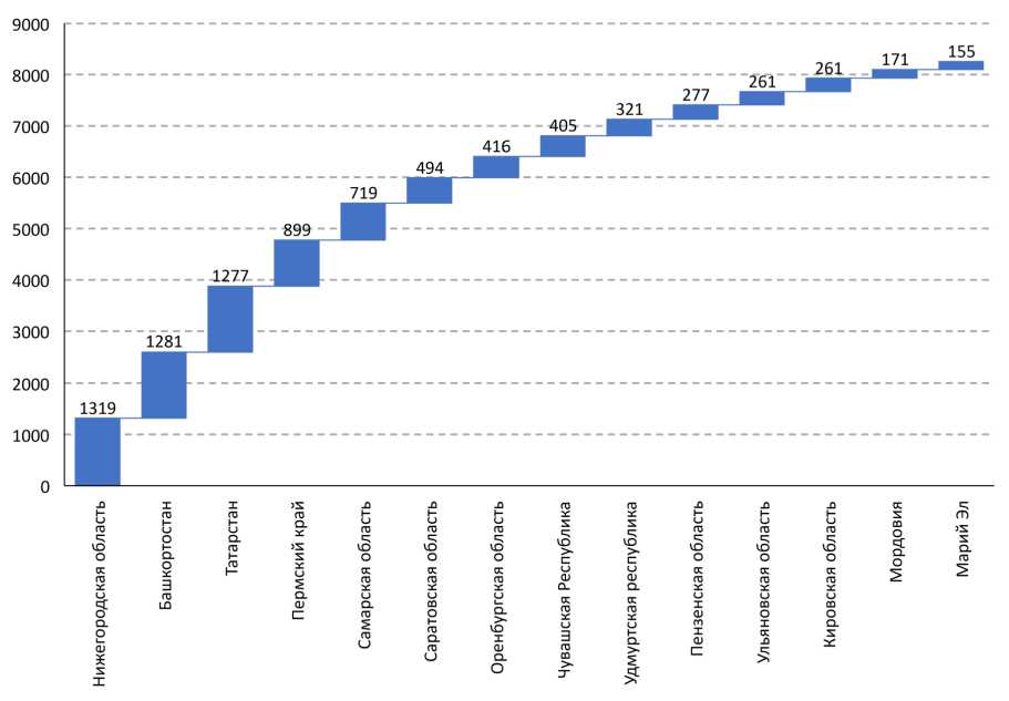 Приволжский федеральный округ включает большое число традиционно промышленных регионов. Однако представленная количественная выборка не отражает прямой зависимости между уровнем промышленного производства и количеством инвестиционных проектов. Это заставляет искать причины в воздействии иных факторов. Лидирующие позиции занимают Нижегородская область, республики Башкортостан и Татарстан. Далее с существенным отрывом расположены Пермский край и Самарская область. Далее с еще большим отрывом с последовательным снижением показателя размещаются остальные регионы. При этом следует отметить явный промышленный профиль, например, Республики Удмуртия. Вместе с тем необходимо подчеркнуть, что без учета стоимости инвестиционных проектов анализ только их количества позволяет судить лишь об общих трендах в этой сфере и не отражает все аспекты реализации инвестиционного потенциала региона.