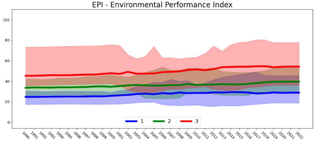 В практике для решения задачи стратегического позиционирования можно выбрать другие системы показателей, например, оценивающие положение стран в финансовой, со-циальной и экологической сферах (в рамках концепции ESG). Однако не следует забывать про субъективность выбираемых рейтингов, что особенно актуально в условиях современ-ной геополитической турбулентности [12]. Например, в качестве системы оценки экологического развития стран может быть выбран Индекс экологической эффективности (Environmental Performance Index – EPI) [13]. Индекс включает 58 показателей, иерархически разделенных по трем целям: «Влияние на изменение климата», «Охрана окружающей среды» и «Здоровье экосистем». Это позволяет комплексно оценить экологическую ситуацию в каждой стране на основе существующих статистических показателей по различным аспектам экологического развития. При этом индекс