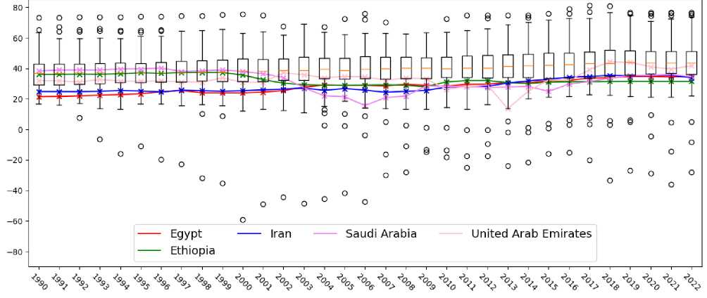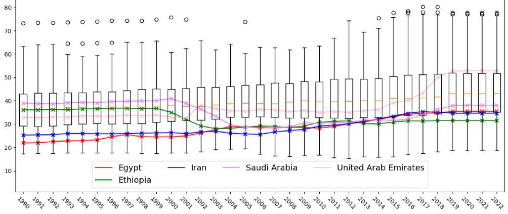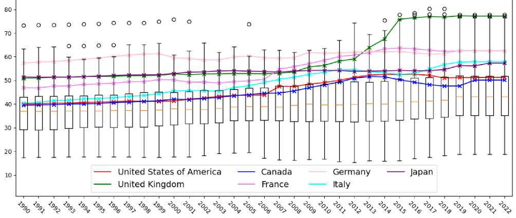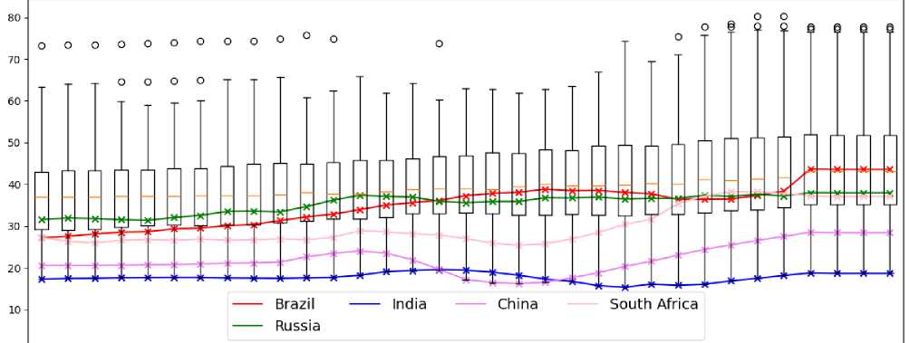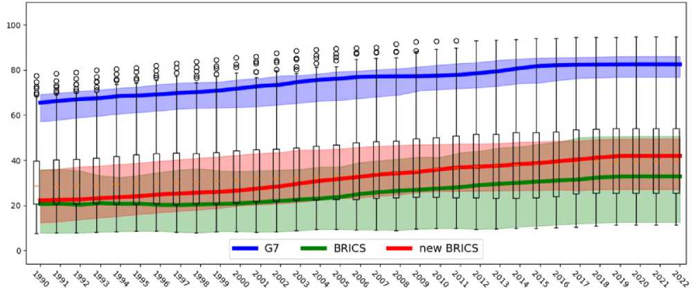 Из результатов моделирования видно, что в значениях индекса отсутствует значимая разница между странами G7 и BRICS. Это подтверждает гипотезу о том, что высокий уровень показателей экологичности этими странами был достигнут в первую очередь за счет вывода со своей территории вредных производств. Такой путь позволяет добиться существенного улучшения экологической обстановки в отдельных странах, что и видно на примере стран G7, но никак не изменяет экологическую ситуацию в мире в целом. Более того, такой подход может привести к ухудшению экологической обстановки, так как создает зоны с экстремально плохой экологической ситуацией, как это происходит в ряде стран Азии и Африки [20; 21].