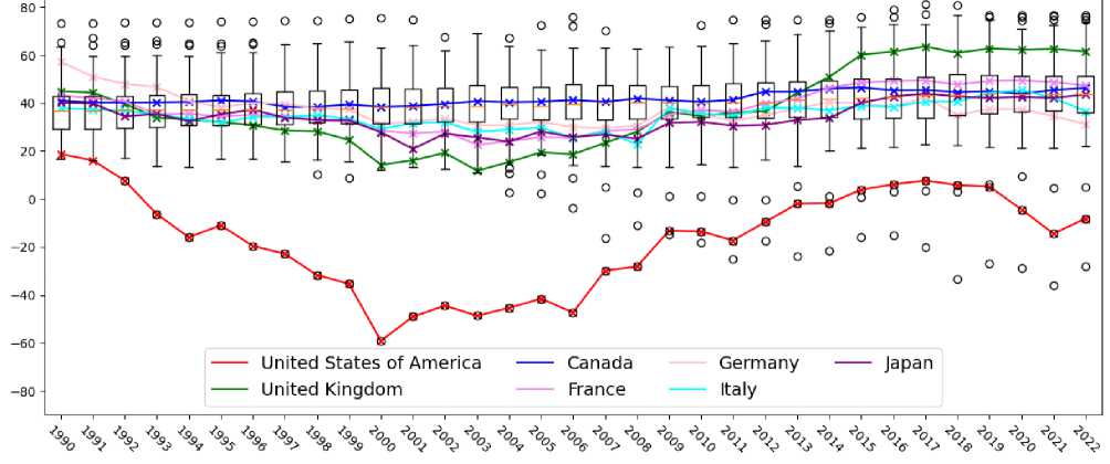 – нормативно-правовыми расхождениями политики экологического развития ведущих стран, что наиболее наглядно видно на примере показателей изменения климата. Добавим, что именно по этому вопросу имеются существенные расхождения в позициях США и европейских стран [16], и судя по этим значениям возможно сделать заключение о «просадке» показателей экологического развития США.