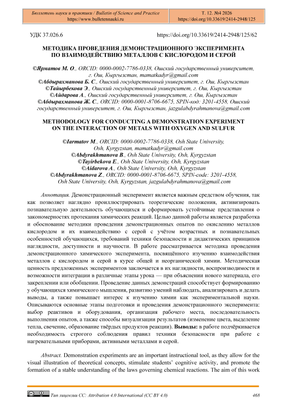 Демонстрационный эксперимент является важным средством обучения, так как позволяет наглядно проиллюстрировать теоретические положения, активизировать познавательную деятельность обучающихся и сформировать устойчивые представления о закономерностях протекания химических реакций. Целью данной работы является разработка и обоснование методики проведения демонстрационных опытов по окислению металлов кислородом и их взаимодействию с серой с учётом возрастных и познавательных особенностей обучающихся, требований техники безопасности и дидактических принципов наглядности, доступности и научности. В работе рассматривается методика проведения демонстрационного химического эксперимента, посвящённого изучению взаимодействия металлов с кислородом и серой в курсе общей и неорганической химии. Методическая ценность предложенных экспериментов заключается в их наглядности, воспроизводимости и возможности интеграции в различные этапы урока — при объяснении нового материала, его закреплении или обобщении. Проведение данных демонстраций способствует формированию у обучающихся химического мышления, развитию умений наблюдать, анализировать и делать выводы, а также повышает интерес к изучению химии как экспериментальной науки. Описываются основные этапы подготовки и проведения демонстрационного эксперимента: выбор реактивов и оборудования, организация рабочего места, последовательность выполнения опытов, а также способы визуализации результатов (изменение цвета, выделение тепла, свечение, образование твёрдых продуктов реакции). Выводы: в работе подчёркивается необходимость строгого соблюдения правил техники безопасности при работе с нагревательными приборами, активными металлами и серой.