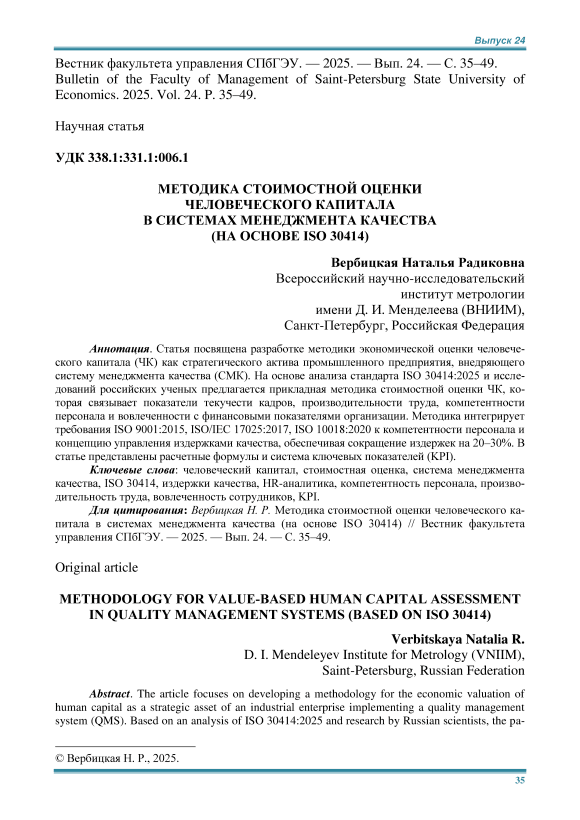 Статья посвящена разработке методики экономической оценки человеческого капитала (ЧК) как стратегического актива промышленного предприятия, внедряющего систему менеджмента качества (СМК). На основе анализа стандарта ISO 30414:2025 и исследований российских ученых предлагается прикладная методика стоимостной оценки ЧК, которая связывает показатели текучести кадров, производительности труда, компетентности персонала и вовлеченности с финансовыми показателями организации. Методика интегрирует требования ISO 9001:2015, ISO/IEC 17025:2017, ISO 10018:2020 к компетентности персонала и концепцию управления издержками качества, обеспечивая сокращение издержек на 20–30%. В статье представлены расчетные формулы и система ключевых показателей (KPI).