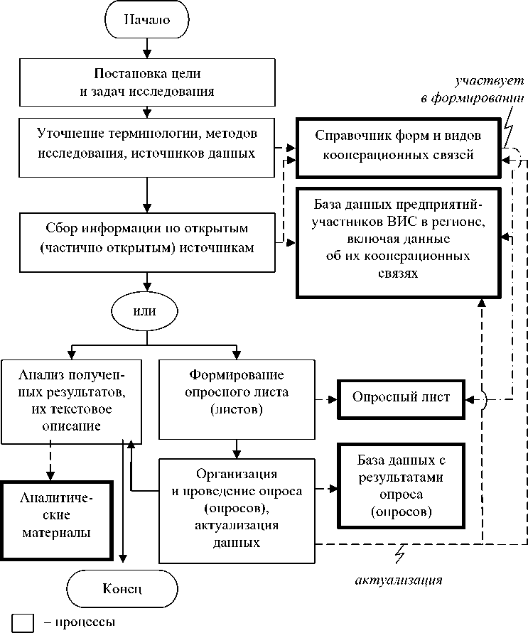Обобщение и группировка рассмотренных выше аспектов и подходов позволяют сформировать базовую, укрупненную схему исследования кооперационных связей в контексте ВИС, определяющих их факторов и результатов (рис. 2). Постановка цели и задач, уточнение терминологии, методов исследования и источников данных традиционно являются первыми этапами исследования. В качестве подготовительной работы формируется справочник форм и видов кооперационных связей, а также пополняемые базы данных предприятий-участников ВИС в регионе для сбора и систематизации первичной информации.