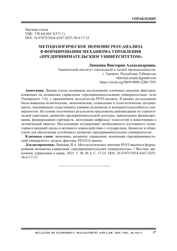 Данная статья посвящена исследованию ключевых внешних факторов, влияющих на механизмы управления «предпринимательскими университетами» (или Университет 3.0), с применением методологии PEST-анализа. В рамках исследования были выявлены политические, экономические, социальные и технологические детерминанты, оказывающие существенное влияние на развитие и конкурентоспособность университетов. На основе полученных результатов предложены рекомендации по стратегической адаптации, развитию предпринимательской культуры, привлечению финансирования, формированию партнерств, интеграции цифровых технологий и инвестициям в человеческий капитал. Исследование подчеркивает необходимость постоянного мониторинга внешней среды и активного взаимодействия с государством, бизнесом и обществом для обеспечения устойчивого развития «предпринимательских университетов».