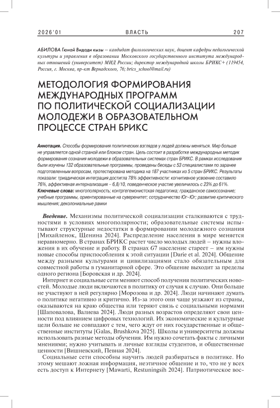 Способы формирования политических взглядов у людей должны меняться. Мир больше не управляется одной страной или блоком стран. Цель состоит в разработке международных методик формирования сознания молодежи в образовательных системах стран БРИКС. В рамках исследования были изучены 132 образовательные программы, проведены беседы с 53 специалистами по заранее подготовленным вопросам, протестирована методика на 187 участниках из 5 стран БРИКС. Результаты показали: триадическая интеграция достигла 78% эффективности: когнитивное усвоение составило 76%, аффективная интернализация – 6,8/10, поведенческое участие увеличилось с 23% до 61%.
