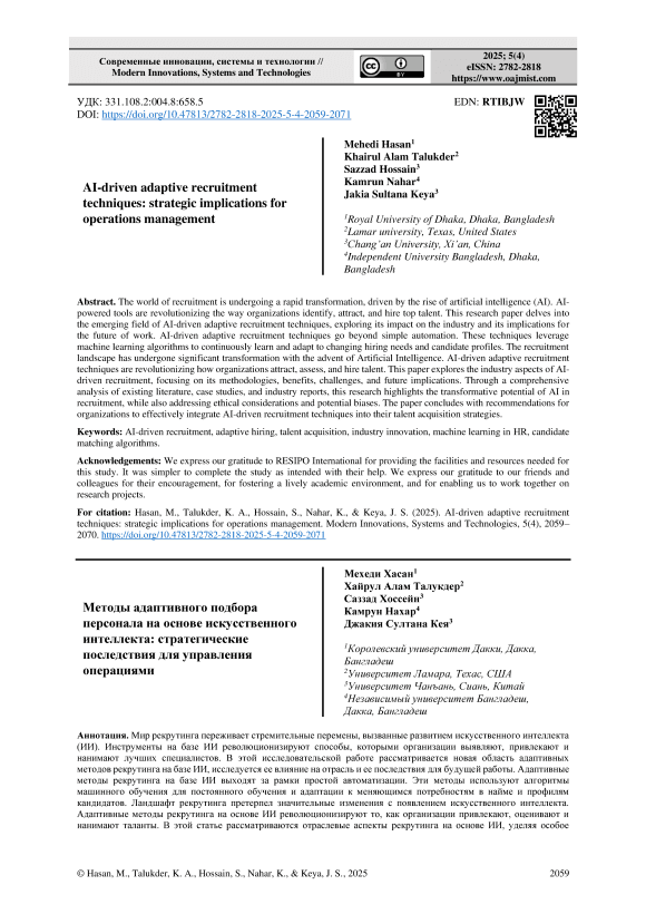 Мир рекрутинга переживает стремительные перемены, вызванные развитием искусственного интеллекта (ИИ). Инструменты на базе ИИ революционизируют способы, которыми организации выявляют, привлекают и нанимают лучших специалистов. В этой исследовательской работе рассматривается новая область адаптивных методов рекрутинга на базе ИИ, исследуется ее влияние на отрасль и ее последствия для будущей работы. Адаптивные методы рекрутинга на базе ИИ выходят за рамки простой автоматизации. Эти методы используют алгоритмы машинного обучения для постоянного обучения и адаптации к меняющимся потребностям в найме и профилям кандидатов. Ландшафт рекрутинга претерпел значительные изменения с появлением искусственного интеллекта. Адаптивные методы рекрутинга на основе ИИ революционизируют то, как организации привлекают, оценивают и нанимают таланты. В этой статье рассматриваются отраслевые аспекты рекрутинга на основе ИИ, уделяя особое внимание его методологиям, преимуществам, проблемам и будущим последствиям. Благодаря всестороннему анализу существующей литературы, тематических исследований и отраслевых отчетов это исследование подчеркивает преобразующий потенциал ИИ в рекрутинге, а также рассматривает этические соображения и потенциальные предубеждения. В заключение в статье приводятся рекомендации для организаций по эффективной интеграции методов рекрутинга на основе ИИ в свои стратегии привлечения талантов.