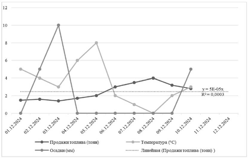 Представленные данные применяются для анализа и построения модели прогнозирования спроса. К примеру, по данной таблице можно провести регрессионный анализ, чтобы выяснить, как температура, осадки, события и конкуренция влияют на объем продаж топлива.