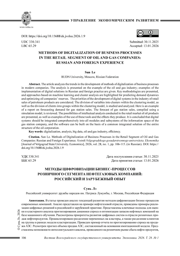 The article analyzes the trends in the development of methods of digitalization of business processes in modern companies. The analysis is presented on the example of the oil and gas industry; examples of the implementation of digital solutions in Russian and foreign practice are given. Key methodologies are presented, and approaches based on machine learning and cluster analysis are highlighted for predicting demand dynamics and optimizing oil companies’ reserves. The priorities of the development of digital systems in the industry of retail sales of petroleum products are considered. The division of variables into clusters within the clustering model, as well as the division of clients into groups within the clustering model, is studied and analyzed. Here is an example of a report on forecasting demand for gas station sales. The forecast of gas station sales, compiled using a simulation model, is reviewed. The possibilities of intellectual analysis conducted in the retail market of oil products are presented, as well as examples of the use of these tools and the effects they produce. It is concluded that digital systems should be integrated comprehensively into all modules and subsystems of the information space of the gas station company, and the software can be built on the basis of a common integrated solution of the entire structure of the oil corporation.