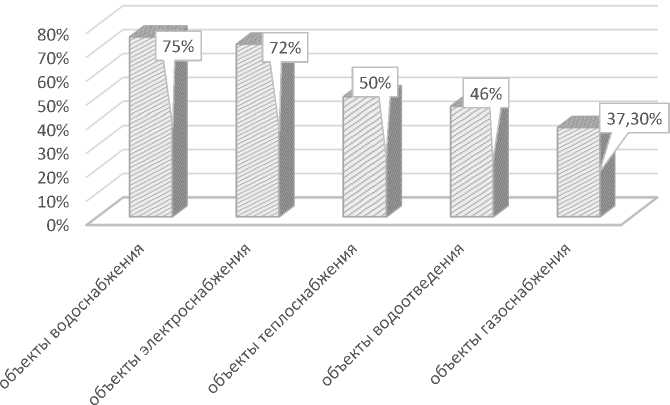 Говоря о структурных элементах ИИКГ, необходимо подробно рассмотреть ключевые объекты, которые обеспечивают жизненно необходимые потребности населения в ресурсах. И, в первую очередь, речь идет о системах городской энергетики, а также водопроводно-канализационном хозяйстве города. Сведения по степени износа данных объектов представлены на рис. 1. Как видно из представленной диаграммы, наибольший износ основных фондов (75%) приходится на объекты водоснабжения. 72% и 50%, соответственно, составляет износ сетей электроснабжения и теплоэнергетики, причем 42% тепловых сетей России нуждаются в полной замене (см.: . Изношенность меньше половины наблюдается в системах городской канализации и на объектах газоснабжения. К сожалению, ситуация с каждым годом только ухудшается.