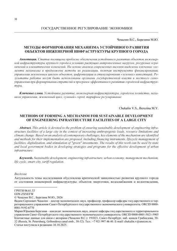 Устойчивое развитие, инженерная инфраструктура, городское хозяйство, механизм управления, жизненный цикл, «умный» город, тарифное регулирование