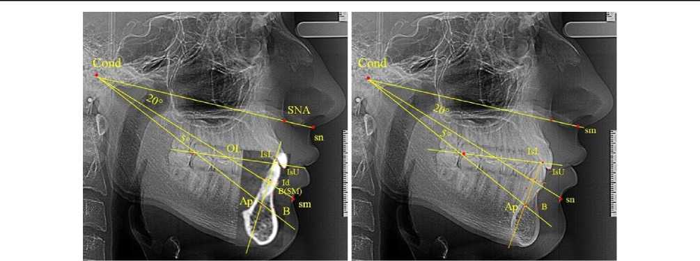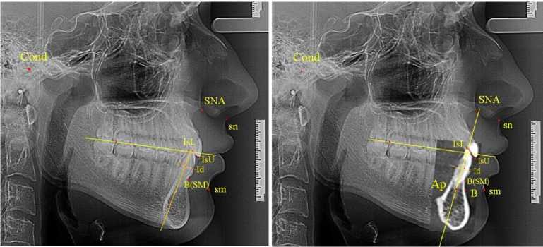 В данном исследовании предложено на боковую телерентгенограмму накладывать фрагменты зубочелюстных резцовых сегментов и костных элементов нижнечелюстного сочленения. Такой метод позволяет оценить положение точечных ориентиров, как на слуховой проход или суставную головку, а также определить положение верхушек корней медиальных резцов.