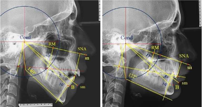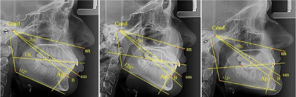 Таким образом, при физиологической окклюзии вне зависимости от типологических особенностей нижнечелюстного угла величина назально-суставного угла (sn-Cond-sm) в пределах 20° определяла оптимальную высоту прикуса и вертикальные размеры переднего отдела гнатической части лица. В то же время угол sm-Cond-Ар в пределах 5° позволял его использовать в качестве ориентира апикальной точки нижнего медиального резца на боковых ТРГ вне зависимости от наложения рядом расположенных рентгеноконтрастных структур.