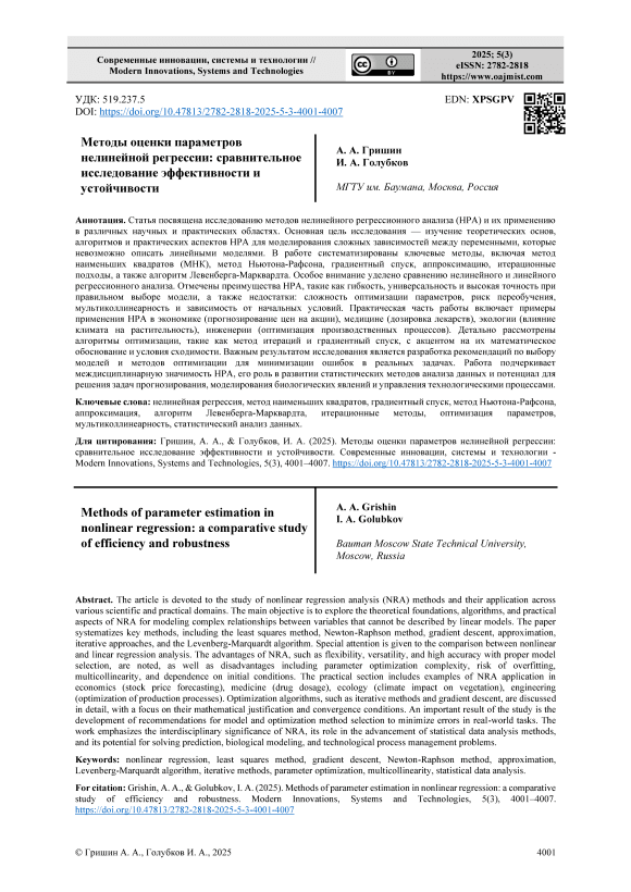 Статья посвящена исследованию методов нелинейного регрессионного анализа (НРА) и их применению в различных научных и практических областях. Основная цель исследования — изучение теоретических основ, алгоритмов и практических аспектов НРА для моделирования сложных зависимостей между переменными, которые невозможно описать линейными моделями. В работе систематизированы ключевые методы, включая метод наименьших квадратов (МНК), метод Ньютона-Рафсона, градиентный спуск, аппроксимацию, итерационные подходы, а также алгоритм Левенберга-Марквардта. Особое внимание уделено сравнению нелинейного и линейного регрессионного анализа. Отмечены преимущества НРА, такие как гибкость, универсальность и высокая точность при правильном выборе модели, а также недостатки: сложность оптимизации параметров, риск переобучения, мультиколлинеарность и зависимость от начальных условий. Практическая часть работы включает примеры применения НРА в экономике (прогнозирование цен на акции), медицине (дозировка лекарств), экологии (влияние климата на растительность), инженерии (оптимизация производственных процессов). Детально рассмотрены алгоритмы оптимизации, такие как метод итераций и градиентный спуск, с акцентом на их математическое обоснование и условия сходимости. Важным результатом исследования является разработка рекомендаций по выбору моделей и методов оптимизации для минимизации ошибок в реальных задачах. Работа подчеркивает междисциплинарную значимость НРА, его роль в развитии статистических методов анализа данных и потенциал для решения задач прогнозирования, моделирования биологических явлений и управления технологическими процессами.