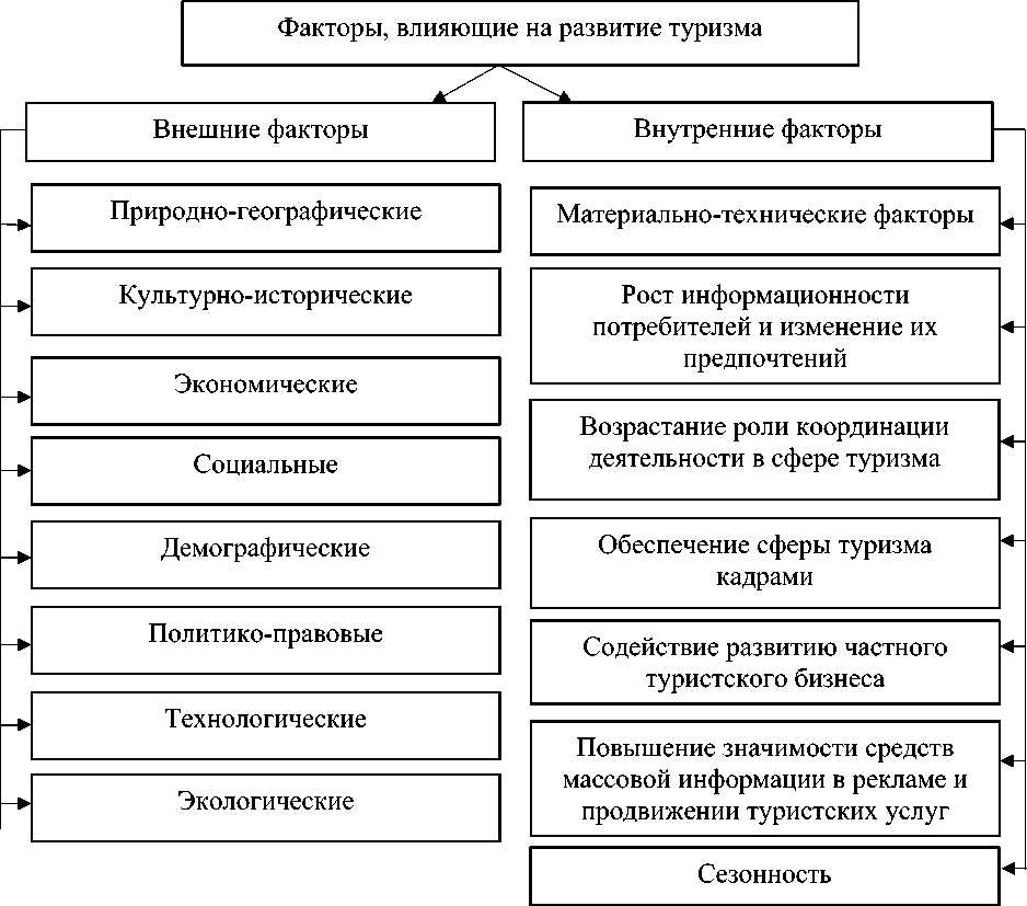 Факторы, воздействующие на туризм, подразделяются на два вида: внешние и внутренние. Внешние факторы воздействуют на туризм посредством происходящих в жизни общества изменений и имеют неодинаковую значимость для различных элементов системы туризма. [10L