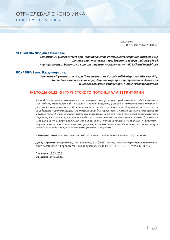 Методология оценки туристского потенциала территории представляет собой комплексный подход, направленный на анализ и оценку ресурсов, условий и возможностей территории для развития туризма. Она включает несколько этапов и методов, которые позволяют определить привлекательность территории для туристов, а также выявить перспективы и ограничения для развития туристской индустрии, который позволяет всесторонне изучить территорию с точки зрения ее пригодности и перспектив для развития туризма. Этот процесс включает анализ различных аспектов, таких как природные, культурные, инфраструктурные и социальноэкономические ресурсы, а также выявление факторов, которые могут способствовать или препятствовать развитию туризма.