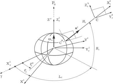 Поверхность Земли моделируется эллипсоидом вращения, сжатого в направлении полюсов, с полуосями ae, ce и коэффициентом полярного сжатия ap = 1 — (ce I ae) . Преобразование эллипсоидальных геодезических координат Lс, Bс, Hс в ортогональные геодезические координаты X‘,Yce, ZC точки С выполняется по аналитическим соотношениям хе = (Nс + H с) Свс Clci YC = ( Nс + Hc) С^'; Ze = ((1 — ep) Nc + Hc) Sbc, где Sa = sin a, Ca = cosa, N c = ae I(1 — epSp )112 и ep = (1 — (1 — ap )2)112 - радиус кривизны первого вертикала и эксцентриситет меридианного эллипса, соответственно.