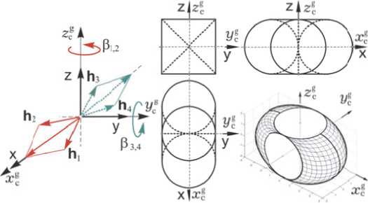 В СУД миниспутника п р именяется СГК с четырьмя ГД по с хеме 2 -SP E , рис. 10. В е ктор КМ p -го rah „ ( р „ ) = h8 h p ( р „ ), p = 1 ^ 4, и м еет орт h p и собстве н ный кинет и ческий мо м ент hg, одинаковый для всех ГД. Век т ор h ( P ) н ормированного КМ к л астера ги р одинов в ы числяется как h ( P ) = Е h p (в p ), где Р = { Р p }, а вектор управляющего момента СГК ф о рмируетс я по соотношениям М g = — Н ‘ = — hg A h( P ) u g, Р = u | с цифровым управлен и ем u g и матрицей A h ( p ) = Э h ( p ) / Э р .