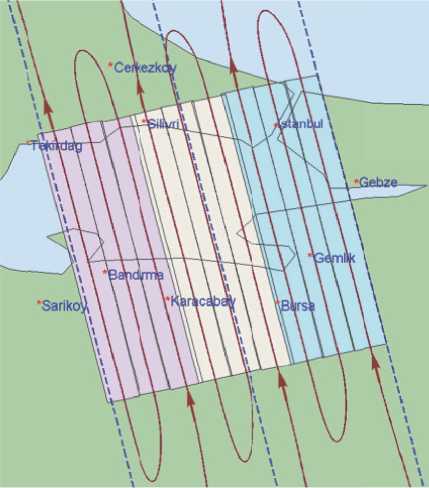 На рисунке 11 представлена карта c тремя локальными площадками мониторинга Босфора и акватории Мраморного моря. Каждая площадка содержит три СМ, которые выполняются тремя МС - левым (МС #1, розовые сканы), центральным (МС #2, желтые сканы) и правым (МС#3, синие сканы) по расположению их трасс в порядке возрастания ДВУ Qi = 370.233 + AQ- (i -1), где i = 1 ^ 3, AQ = 0,84 град, i - номер МС. Здесь каждая площадка имеет размеры 150х44.5 км2, а три площадки составляют площадь 150х131,8 км2.