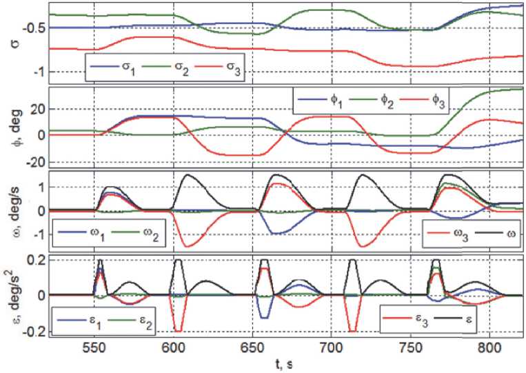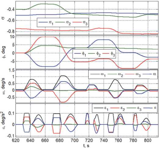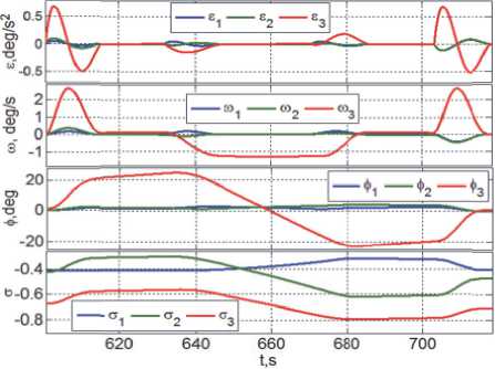 На рисунке 15 приведен синтезированный закон наведения спутника для выполнения маршрутов сканирующей съемки указанных видов и поворотных маневров между ними. Здесь первые два графика представляют ориентацию ССК относительно ИСК (вектор МПР о = { ст i } ) и оск (углы крена ф 1 = y , синий цвет; рыскания ф 2 = ^ , зеленый цвет и тангажа ф 3 =0 , красный цвет). На следующих двух графиках рис. 15 представлены изменения компонент векторов угловой скорости и угло-